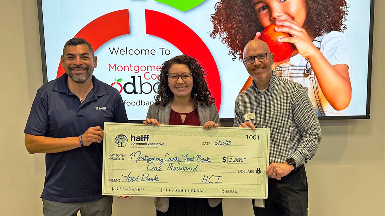 Volunteers from the Houston and The Woodlands offices presented HCI’s $1,000 donation to the Montgomery County Food Bank.